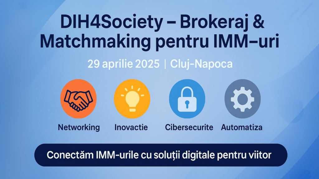 Pe 29 aprilie 2025, DIH4Society va reuni IMM-uri regionale.🎯 Scopul principal al evenimentelor va fi facilitarea transformării digitale. Sesiunile de brokeraj vor prezenta soluții în securitate, semnături și software. În cadrul matchmaking-ului, participanții vor discuta despre audit digital și automatizare. Firmele vor explora aplicații pentru performanță și eficientizarea proceselor interne. Vor fi prezentate studii de […]