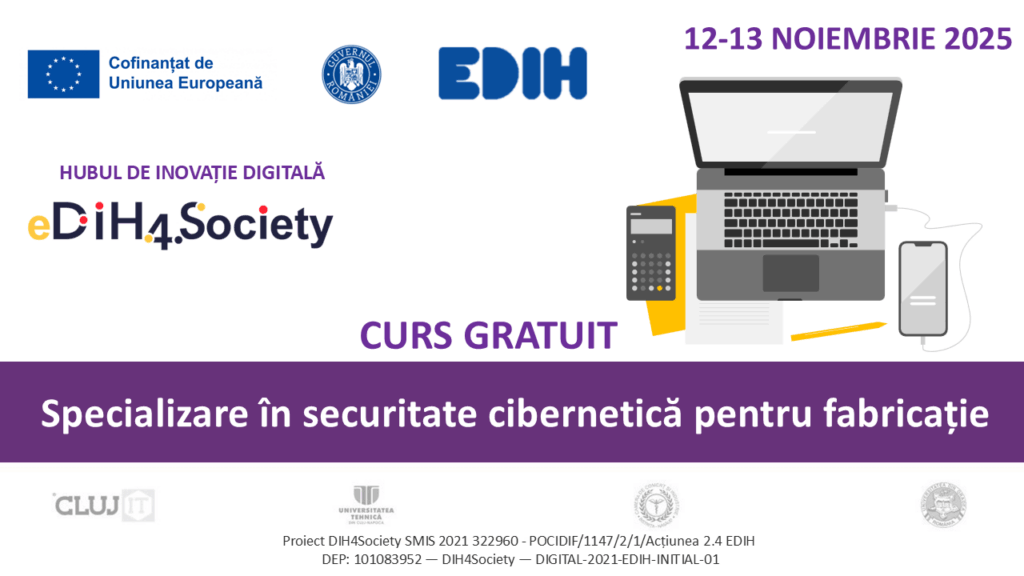 👨💻 Universitatea Tehnică din Cluj-Napoca, în cadrul proiectului DIH4Society, vă invită să participați la un curs dedicat digitalizării IMM-urilor! 📅 Perioada de desfășurare: ➡️ 12-13 noiembrie 2025: 14:00 – 18:00 ⏱️ Durată: 8 ore 📍 Mod de desfășurare: Online, pe platforma Microsoft Teams 📄 Materiale: Suport de curs electronic & certificat de participare 👩🏫 Lectori: Cadre […]